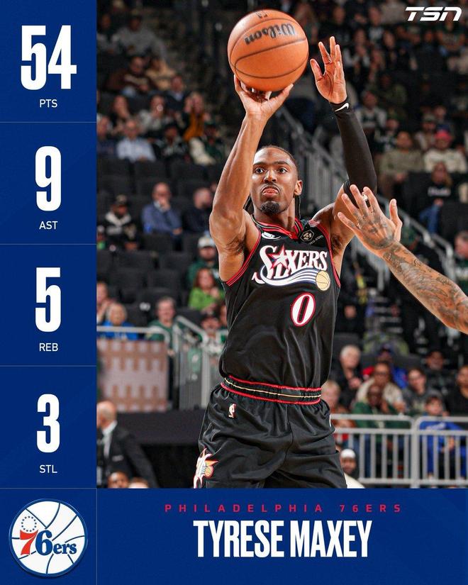马克西54+9+6记3分创2大NBA第2神迹,还刷爆纪录,76人力擒雄鹿