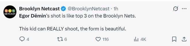 篮网媒体:杰明这个孩子的投篮动作非常优美,他至少是篮网投射前三的球员。